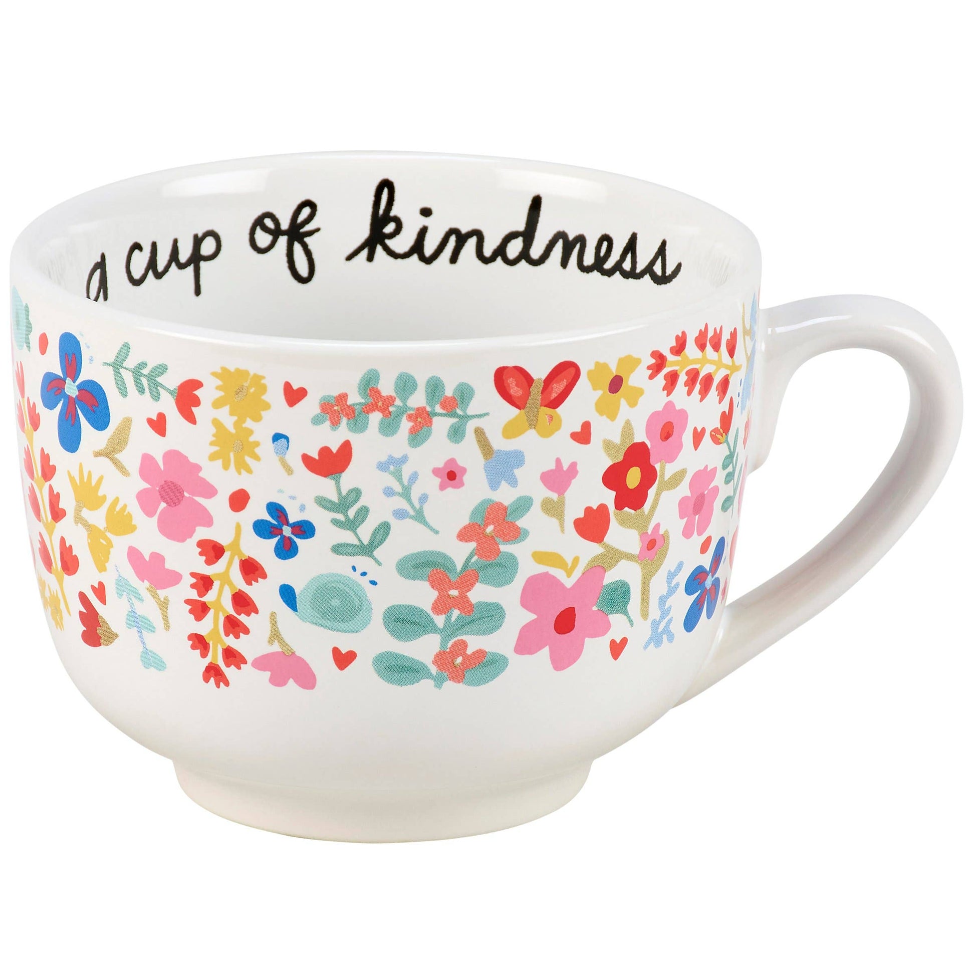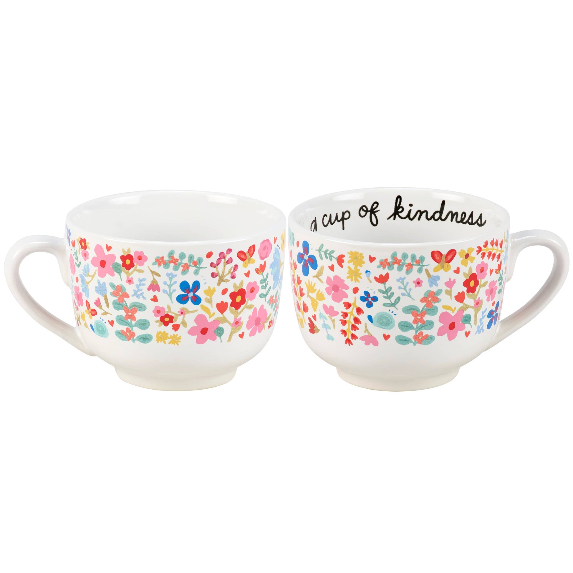 A stoneware 20 oz mug from our Inspiration & Blooms Collection displaying a full wrap-around design of vibrant hand illustrated florals. Mug also features an inside design with inspirational sentiment along the rim that reads "A Cup Of Kindness" and butterfly at the bottom. Our A Cup Of Kindness mug is microwave, oven, dishwasher, and food safe for easy use. An inspirational gift perfect for everyday drinkware.