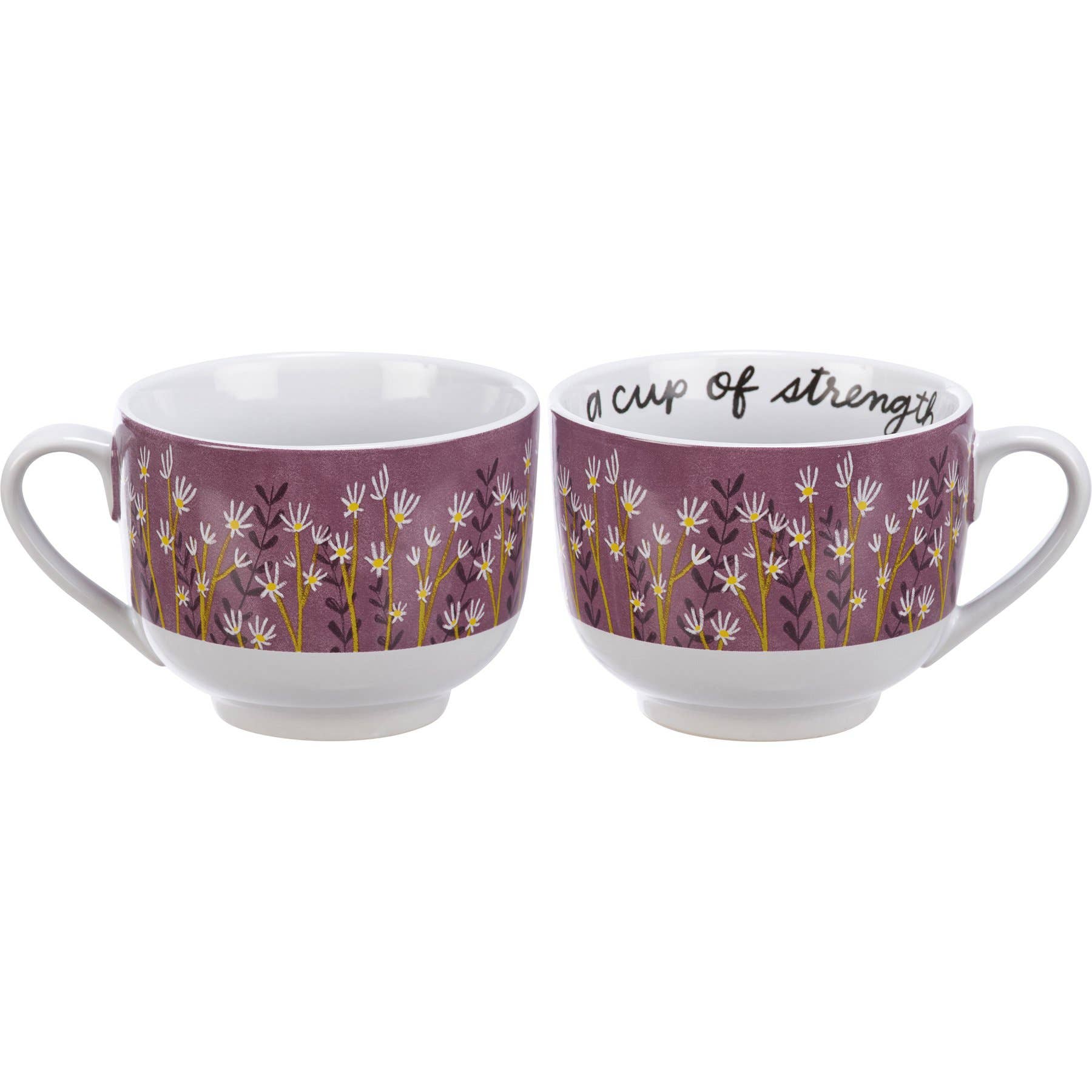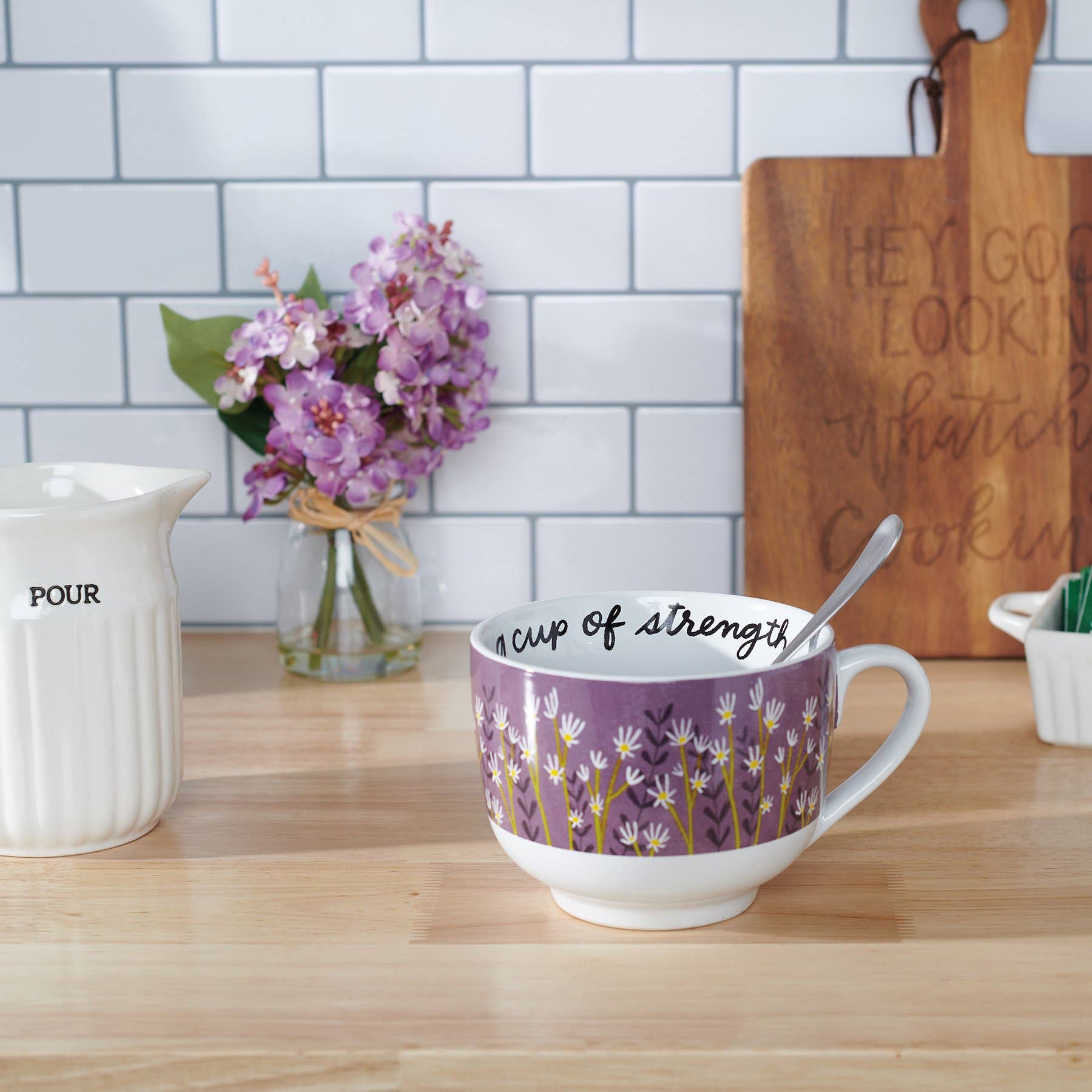 A stoneware 20 oz mug from our displaying a full wrap-around design of hand illustrated stemmed florals on a deep purple background. Mug also features an inside design with "A Cup Of Strength" sentiment along the rim and a white flower in a purple circle at the bottom. Our A Cup Of Strength mug is microwave, oven, dishwasher, and food safe. An inspirational mug perfect for everyday drinkware.