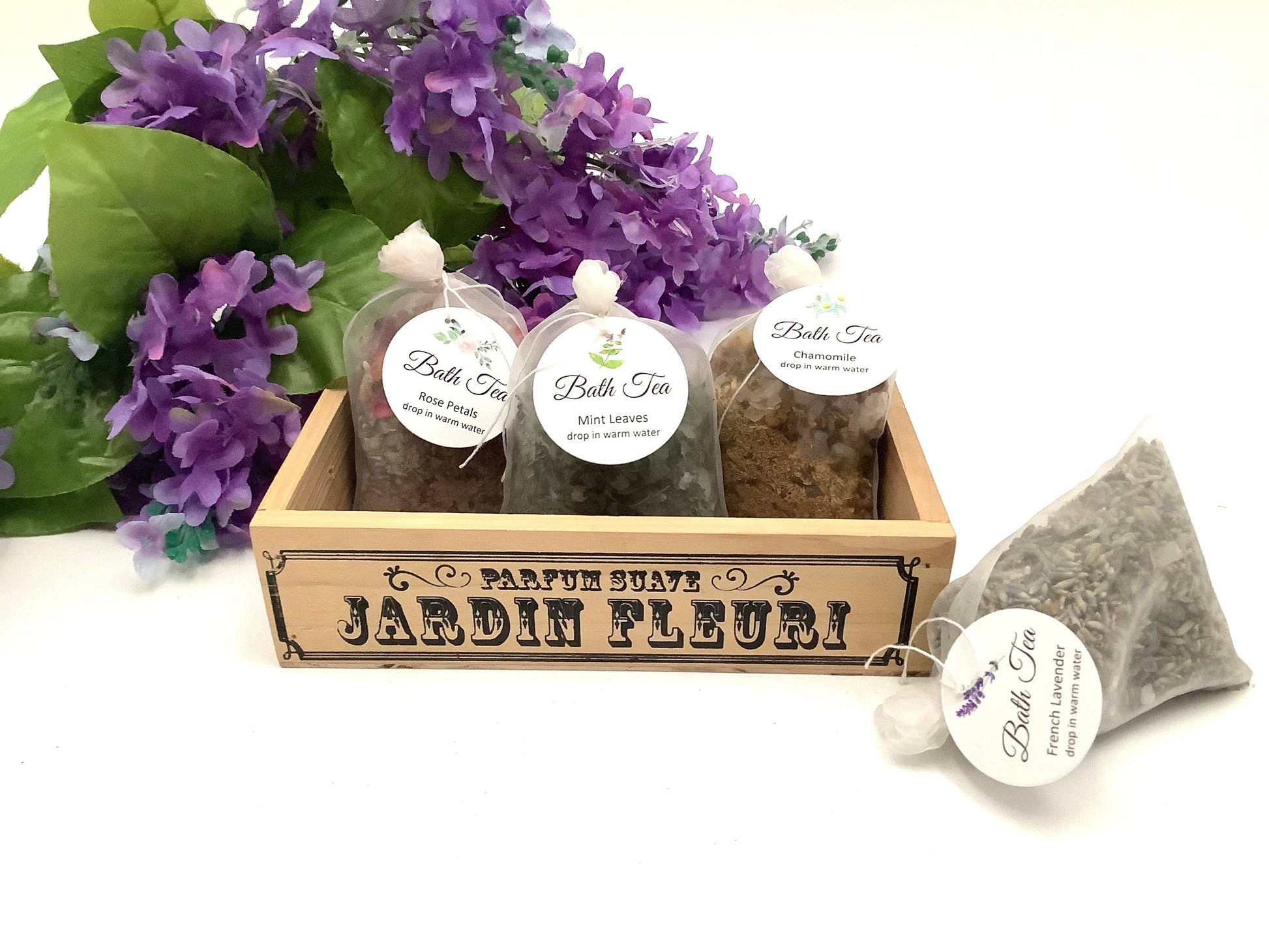 Transform your bath from an everyday experience to a spa-like retreat! Double filter tea bag filled with natural ingredients (no chemicals) Fill your bathtub and toss Bath Tea Bag into the water... that easy! The tea bag itself measures 3" x 4.5" it is filled with 1/2 to 3/4 cup of salts and flowers/teas/herbs the finished product is packaged in 4" x 6" packaging Each Bath Tea Bag is Individually wrapped and labelled