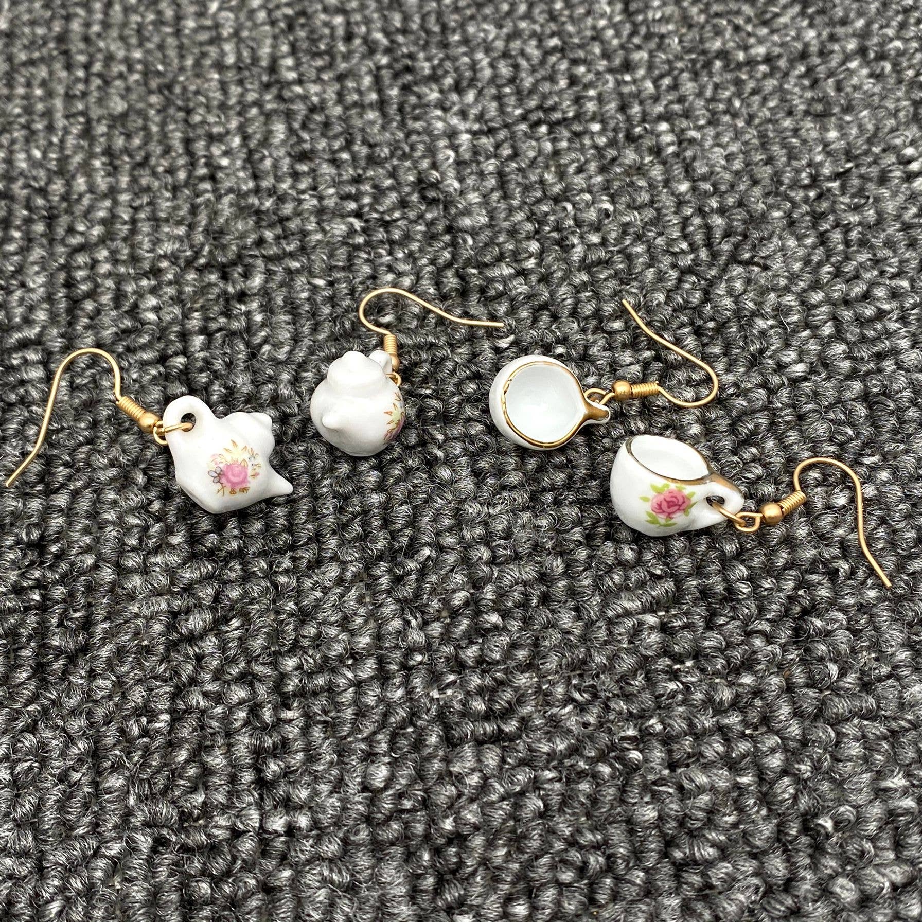 Pink flower Ceramic Teapot & Tea Cup Charm Dangle Earrings: Teapot