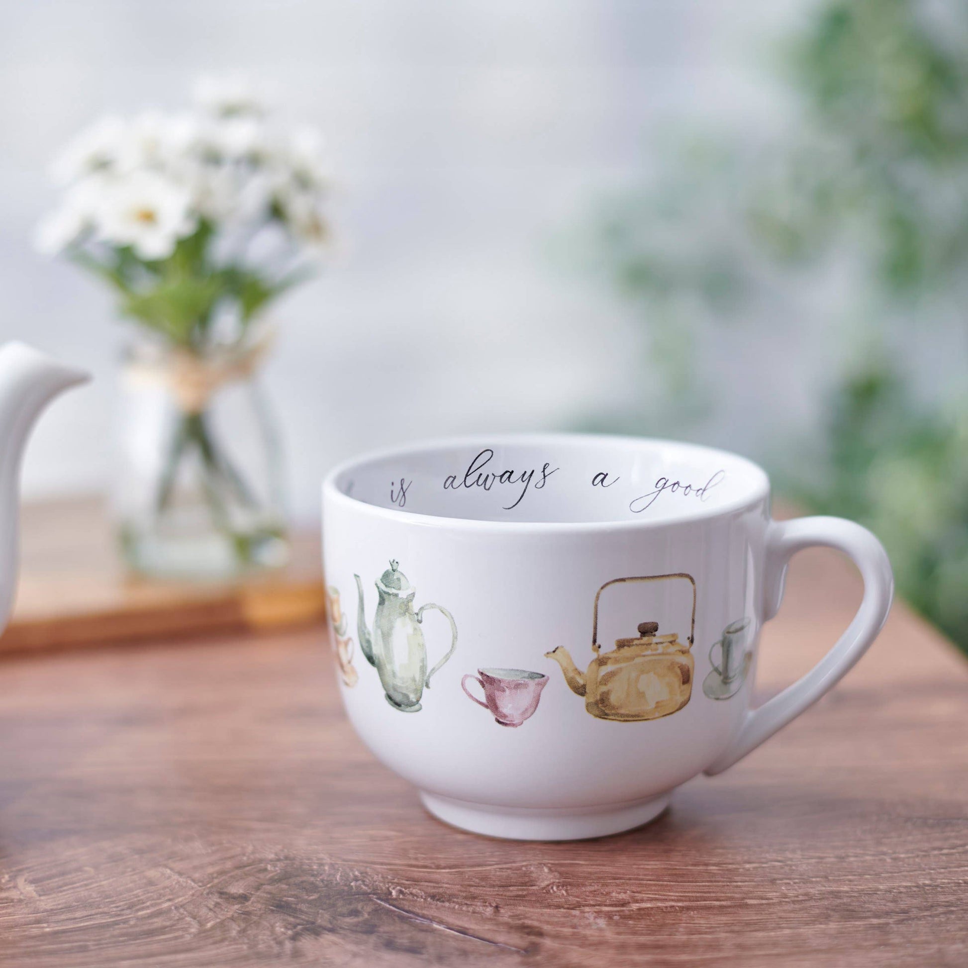 A stoneware 20 oz mug from our Tea Collection displaying a full wrap-around design of hand painted teacups, teapots and tea kettles. Mug also features an inside polka dot design at the bottom of the mug with tea-themed sentiment along the rim that reads "Tea Is Always A Good Idea." Our Tea Is Always A Good Idea mug is microwave, oven, dishwasher, and food safe. A charming tea-themed mug perfect for everyday drinkware.